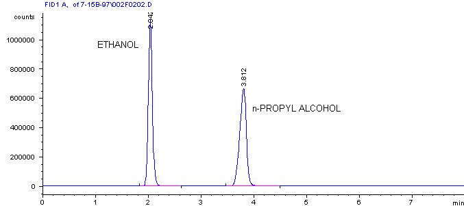 From the stock solution of 10.00 ml 99.7+% ethanol diluted to 100 ml with water, take (for example) 7.00 ml, 8.00 ml, 9.00 ml, and 10.00 ml aliquots into separate vials, each containing 25.00 ml of the prepared n-propyl alcohol internal standard solution in water. Chromatogram attached, if I am successful (hey, I'm a Consumer Products Guy, not a Computer Guy !).