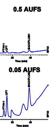 terms of Absorbance Units Full Scale or AUFS). However the precision of peak size for very small bands is not just a function of how tall the band is on the recorder strip chart. It also depends on the NOISE in the baseline. If the baseline is erratic or drifts, as in the case of the 0.05 AUFS chromatogram, the peak height is limited by our inability to precisely measure the baseline. We say that the SIGNAL-TO-NOISE RATIO is small. Decreasing the detector attenuation does not by itself improve the signal-to-noise, because baseline noise increases in proportion to peak height. However bigger peaks are easier to measure manually (a data system does not care what attenuation you use, but it is affected by attentuation changes at the detector).