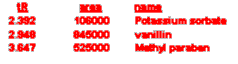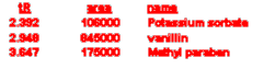 Calibration data for methyl paraben showing retention times (tR), peak area, and name for each peak in the calibration runs |