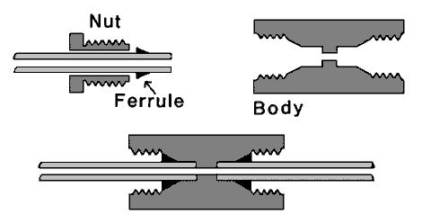 This type of fitting is referred to as "zero-dead-volume" (ZDV), because the passage through the fitting is the same diameter as the inside of the tube.