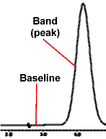 | PEAK: The deviation from baseline in a chromatogram caused by the properties of the analyte as it transits the detector cell. In practice, the terms peak and band are often used interchangeably; in principle, a band is the distribution of analyte molecules in the chromatographic system, while a peak is the trace detector response as the band passes through the detector. |