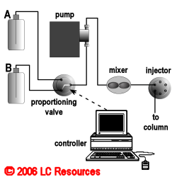 Low-pressure mixing systems (also referred to as "one-pump" systems) use a single high-pressure pump. The pump inlet is connected to a proportioning valve which alternately selects from the "A" or the "B" reservoir. The controller specifies the percentage of time during which the valve is connected to each reservoir to provide the desired composition (e.g., for 75%A/25%B, the proportioning valve would spend 75% of the time connected to the "A" reservoir). Low-pressure mixing systems are typically more flexible that high-pressure; they are often available with ternary (three solvent) or quaternary (four-solvent) capability. They tend to provide better proportioning accuracy at extreme high or low percentages, but tend to have somewhat larger dwell volumes.